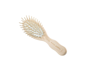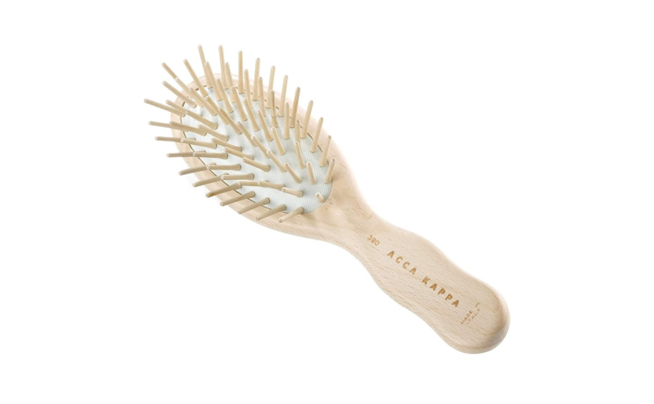 Spazzola piatta con cuscinetti in gomma naturale e spilli in legno con punta arrotondata.