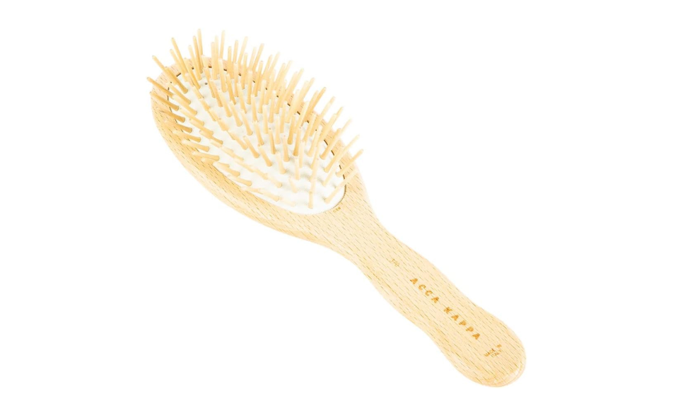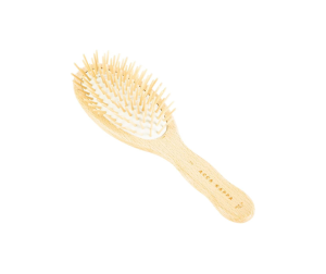 Spazzola piatta con cuscinetti in gomma naturale e spilli in legno con punta arrotondata.