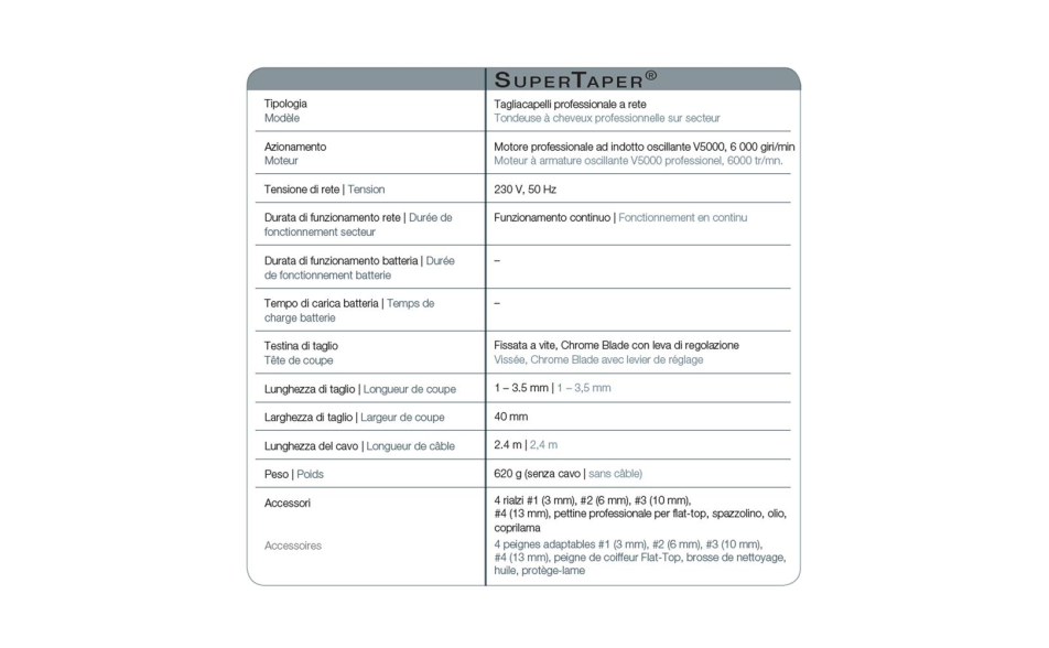 Il Kit contiene: tosatrice Super Taper, 4 rialzi in plastica: 3 - 6 - 10 - 13 mm, olio, coprilama, spazzolino pulizia.