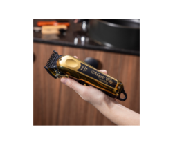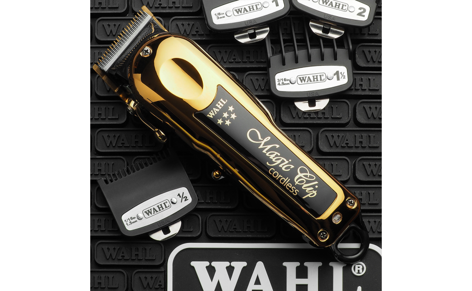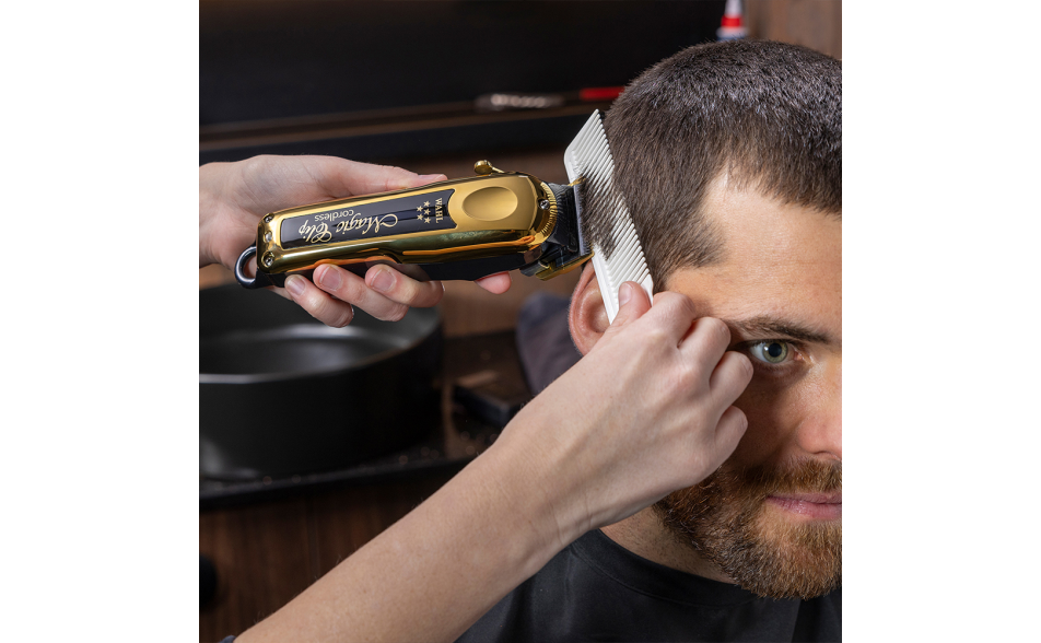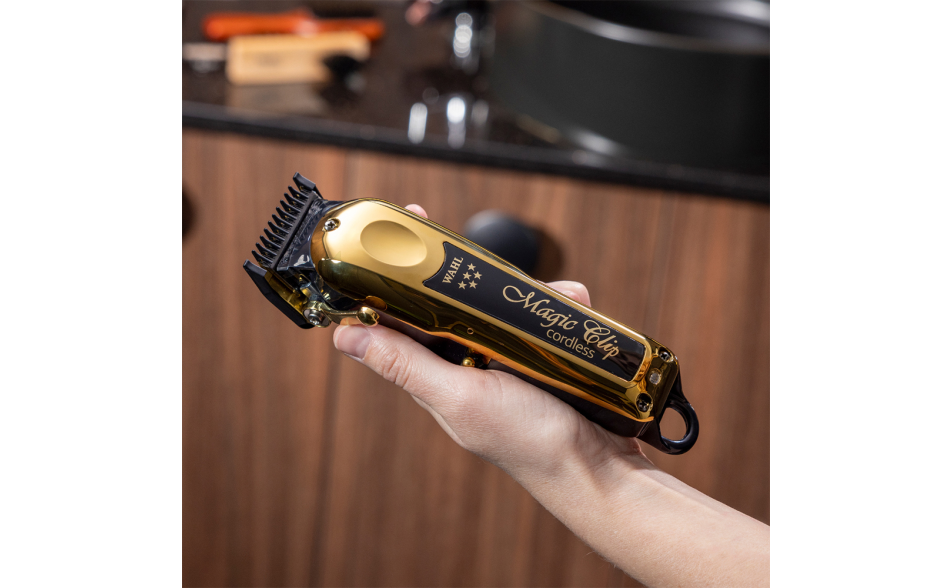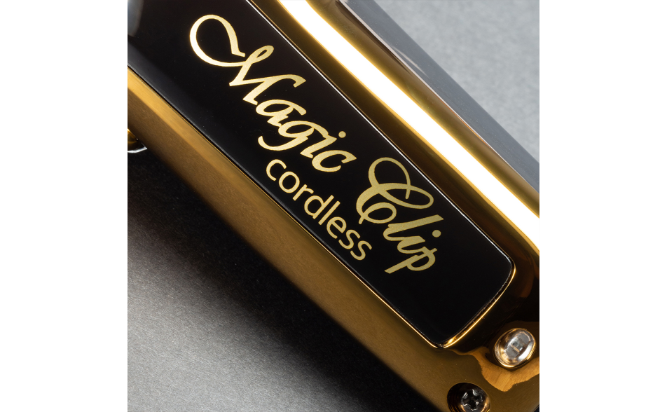 Il nuovo tagliacapelli senza fili Magic Clip in lussuosa versione dorata presenta una testina a denti alternati, con una lunghezza alternata dei denti, ideale per ottenere una sfumatura perfetta senza antiestetiche barrature.